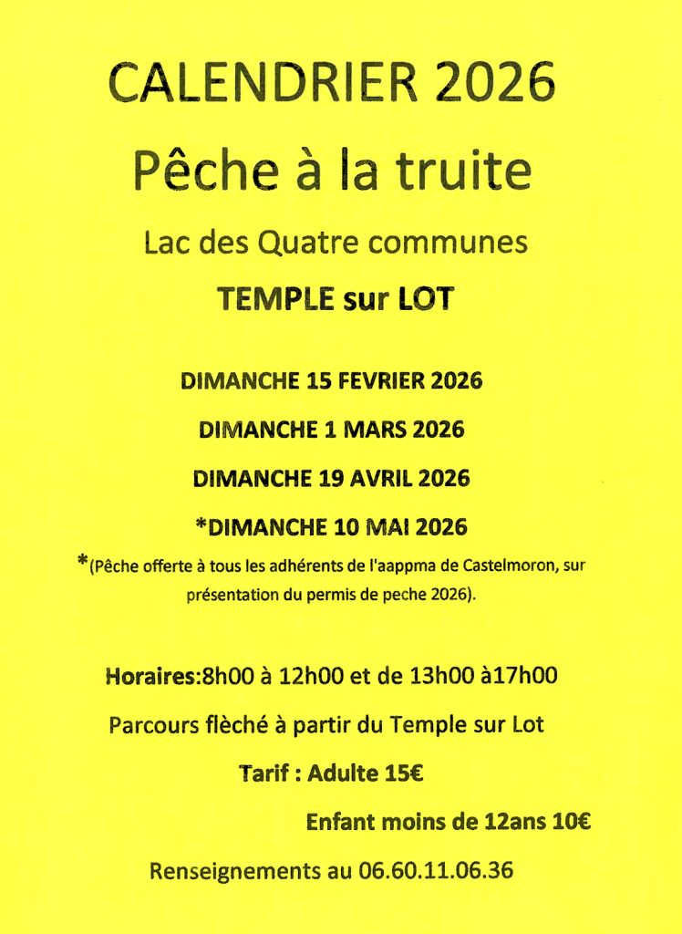 Nous vous informons que les permis de pêche ne peuvent être pris que sur internet sur le site macartedepeche.fr ou auprès de notre seul vendeur à Castelmoron le magasin d’électroménager “EXTRA” de Mr Dollinger place de la fontaine.si vous prenez la carte de votre domicile n’oubliez pas lors de votre choix de l’AAPPMA de bien choisir Castelmoron (47240) afin que notre association puisse vivre le plus longtemps.